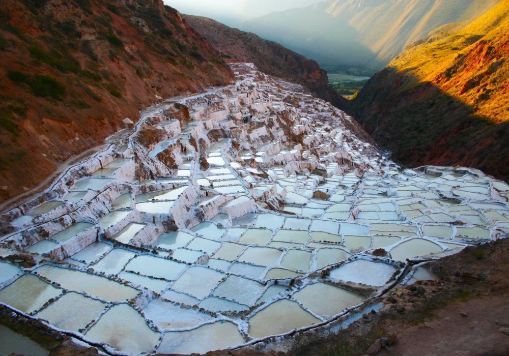 After exploring Moray we’ll head on to Maras, which is just two miles away. Here we’ll see the amazing salt evaporation ponds, which were used by the Incas and quite possibly by pre-Inca civilizations. More than 3,000 salt pools are carved into the mountainside, which catch highly salty water as it emerges from a spring in the mountain. The ponds catch this water, where it slowly evaporates, leaving just the salt behind. This is collected via a communal process and is most famously used to make sal de Maras, the famous pink table salt. It’s an incredible sight looking down across the salt ponds, which look like they are covered in snow or ice.