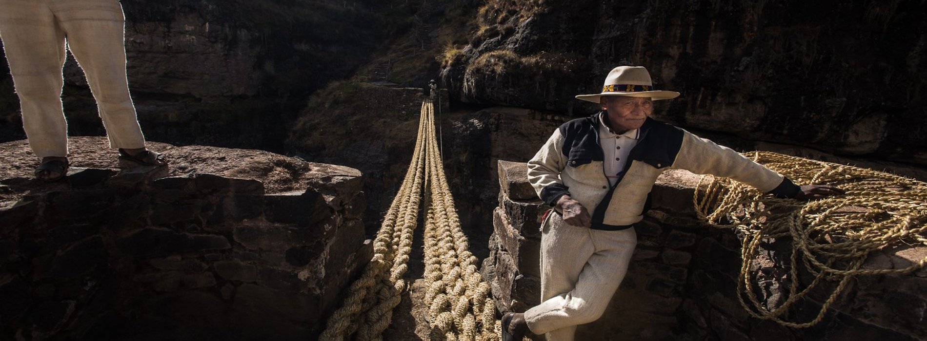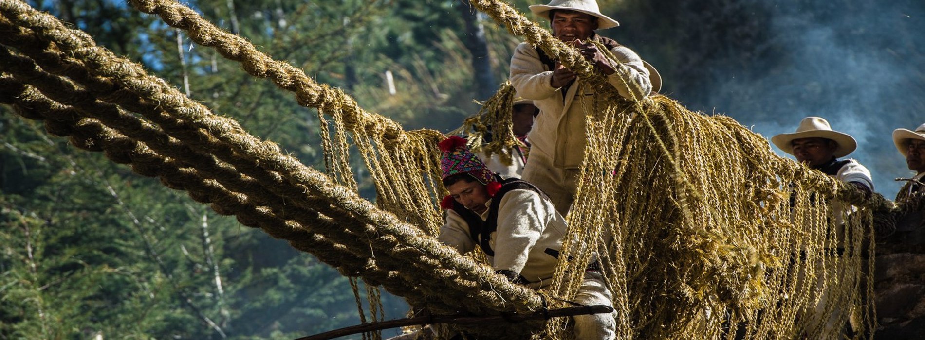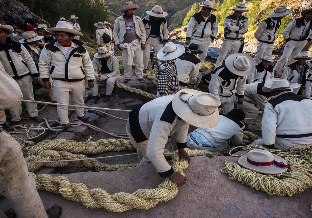 The Qeswachaka Bridge is the last remaining Inca rope bridge, which has been preserved thanks to the efforts of the local community. Built entirely of ropes made from grass, the bridge is renewed each year when locals gather together, forming their grass ropes into cables at the site, while others prepare mats for decking and other important elements for the annual reconstruction effort.