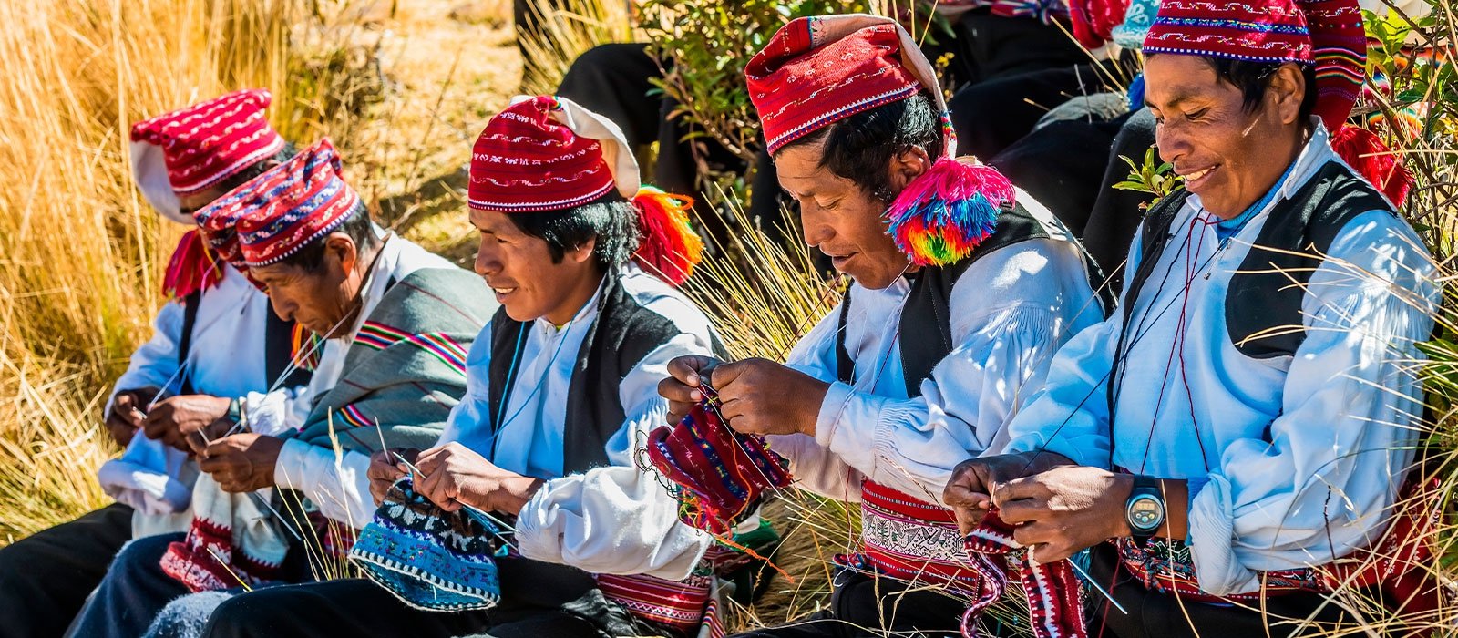 When we get to the floating islands, you will probably be surprised by the scale of these floating reed constructions. The Uros originally built these islands for defensive reasons: if a threat appeared, they could move their island homes to a safer location. The islands are made from cattail reeds that grow around the lake, and each island is in a constant state of rebuilding, as old reeds are replaced with new ones. Entering the islands is quite an experience, as the reed floor feels strange under your feet. We will explore the main island and see the houses, watchtowers, and other structures, all built from reeds. Then one of the locals will give a short presentation on how the islands are made and then you can meet one of the local families to see how they live. Next, we head to Taquile, one of the most beautiful islands in Peru, where the traditional way of life is still very much alive. We will meet some of the master weavers of this ancient Andean community, whose textiles are considered among the best in the country. According to legend, the Incas themselves learned to weave from the artisans of this island. In Taquile, the men are the weavers and the women spin the thread.