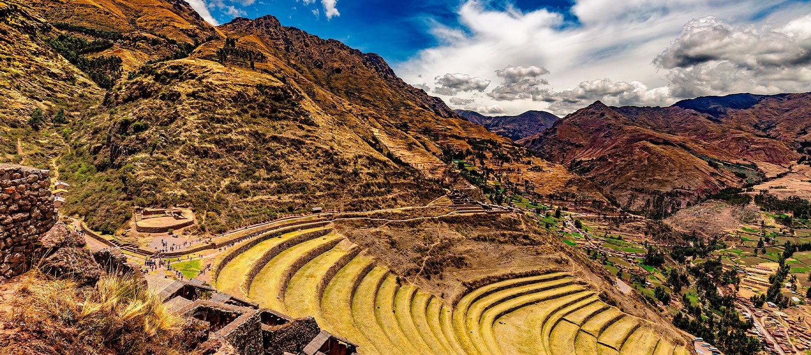 We will pick you up from your hotel in Cusco at 08h00 and then set off on our day trip from Cusco to the Sacred Valley. Leaving Cusco, we’ll pass by Saqsaywaman and head over the mountains before descending some 450 meters (1,500 ft) to the valley floor. Here we’ll find ourselves beside the sacred Urubamba River and the pretty village of Pisac. In Pisac, we will visit the colorful traditional market, where you can browse the array of local artisan work and other souvenirs – which of course you can buy to take home with you. We’ll spend about 30 minutes here, and then head up to the ruins of Pisac which sit atop a hill at the entrance to the valley.